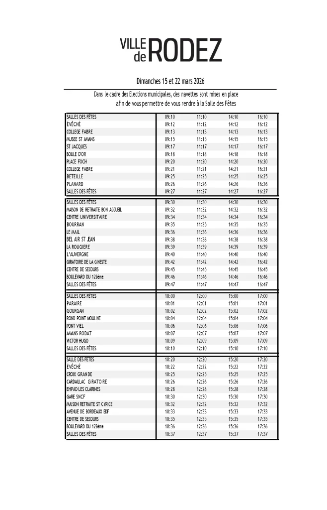 Les dimanches 15 mars et 22 mars 2026, la ville de Rodez met en place une navette gratuite pour vous permettre de vous rendre au bureau de vote situé à la salle des fêtes de Rodez.